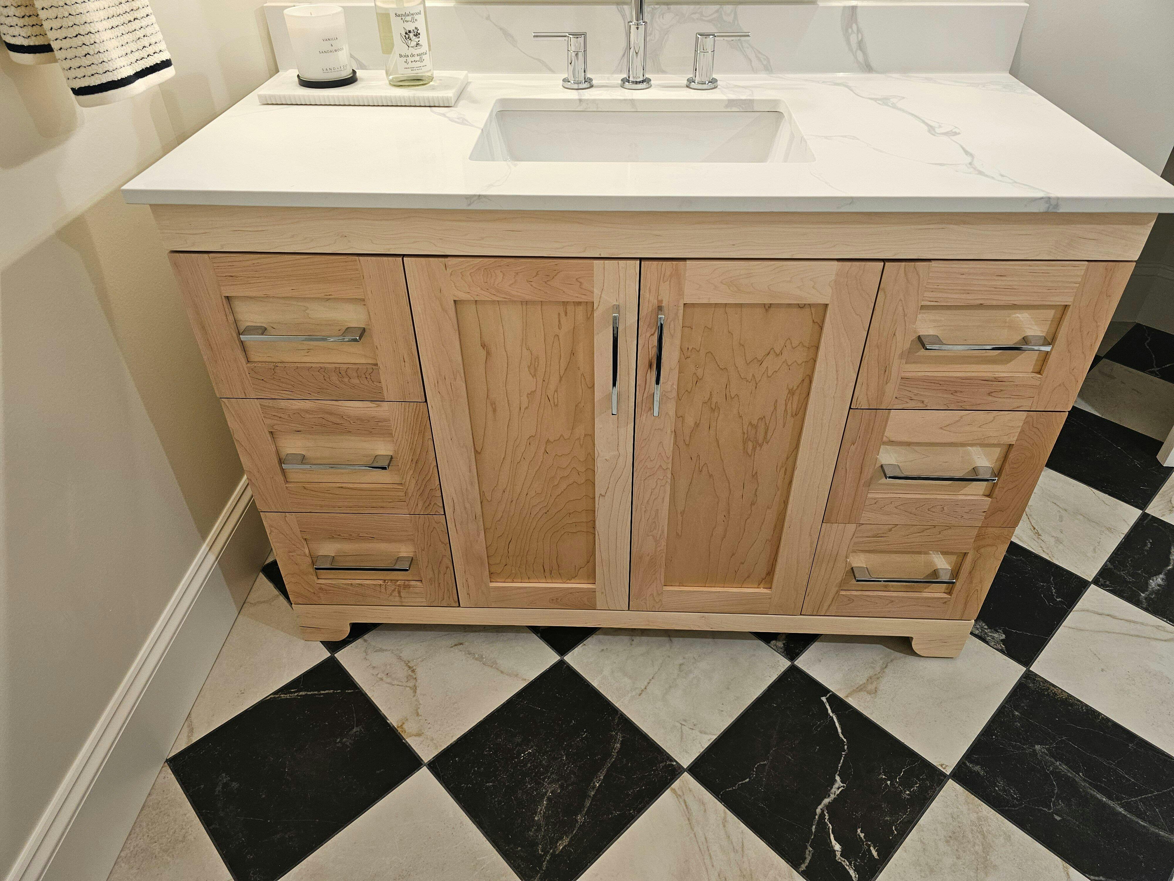 With wood construction and a natural maple finish, this series is sure to leave your bathroom looking modern and stylish. Boasting a 2cm pure quartz countertop, this unit is built to last and leave an impression. Fully soft closing drawers and doors are available on all sizes within this collection. The cabinet comes fully assembled and can be customized with countertop spacing and hardware options. Faucet and mirror not included.