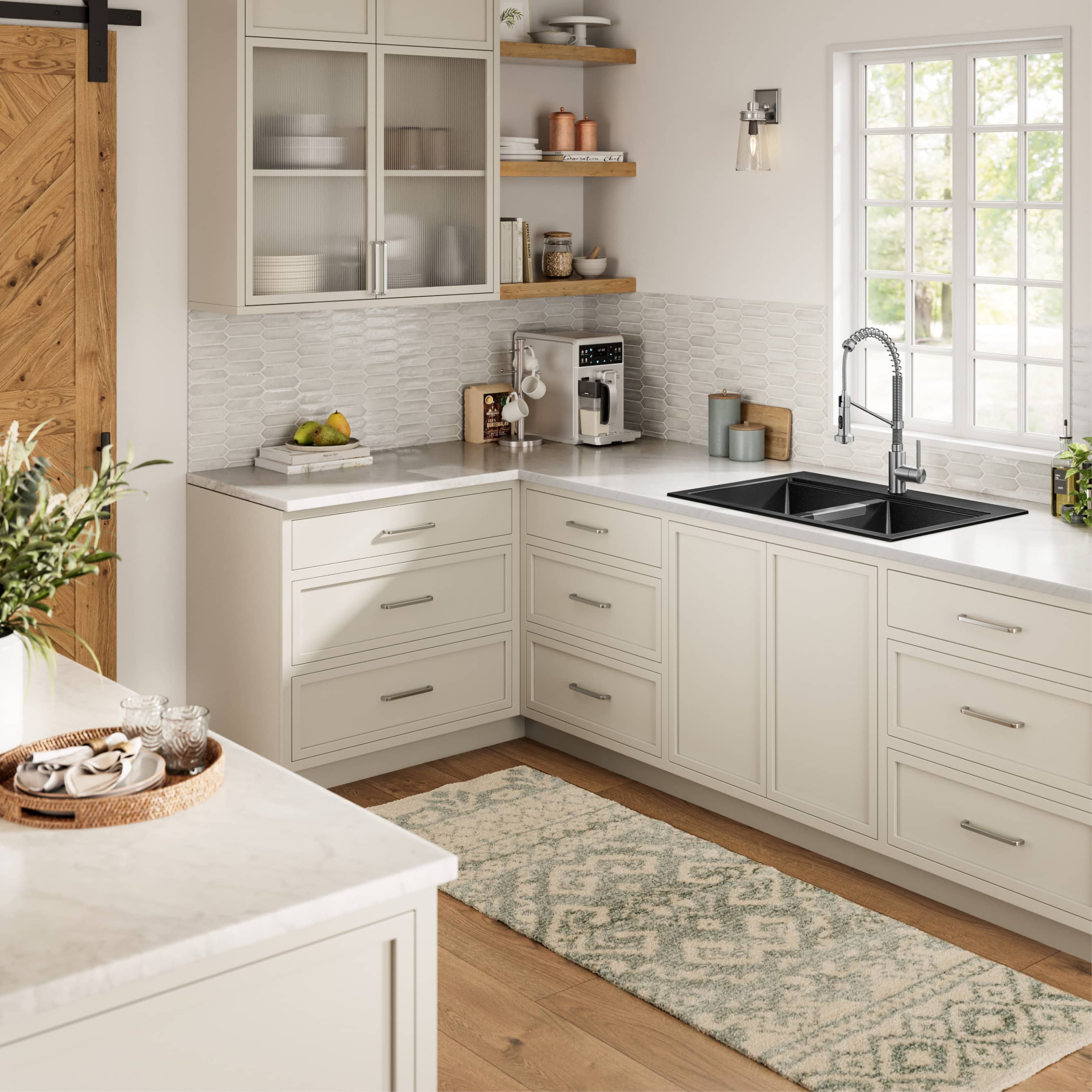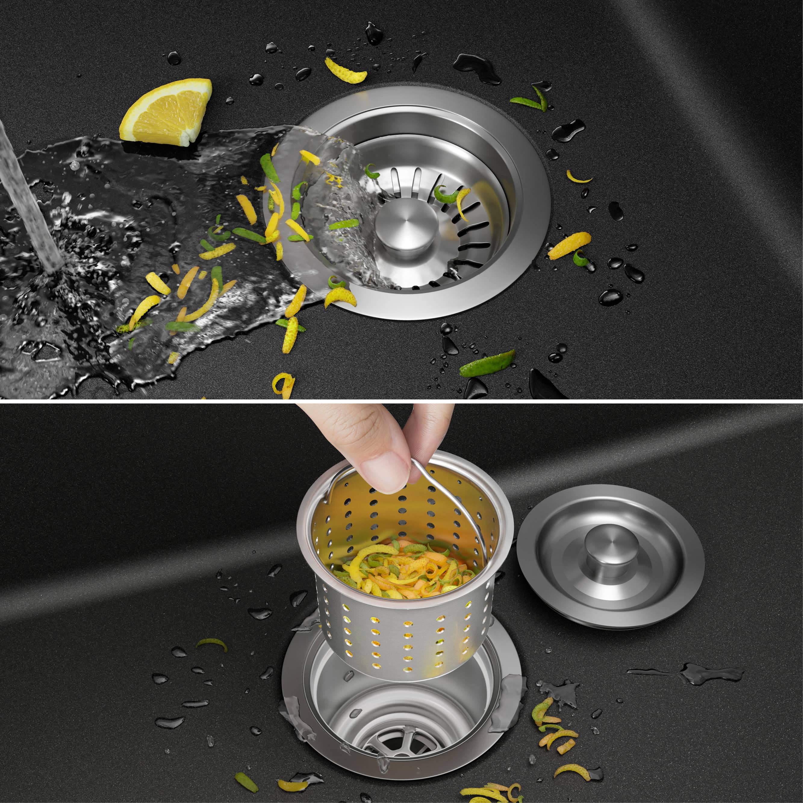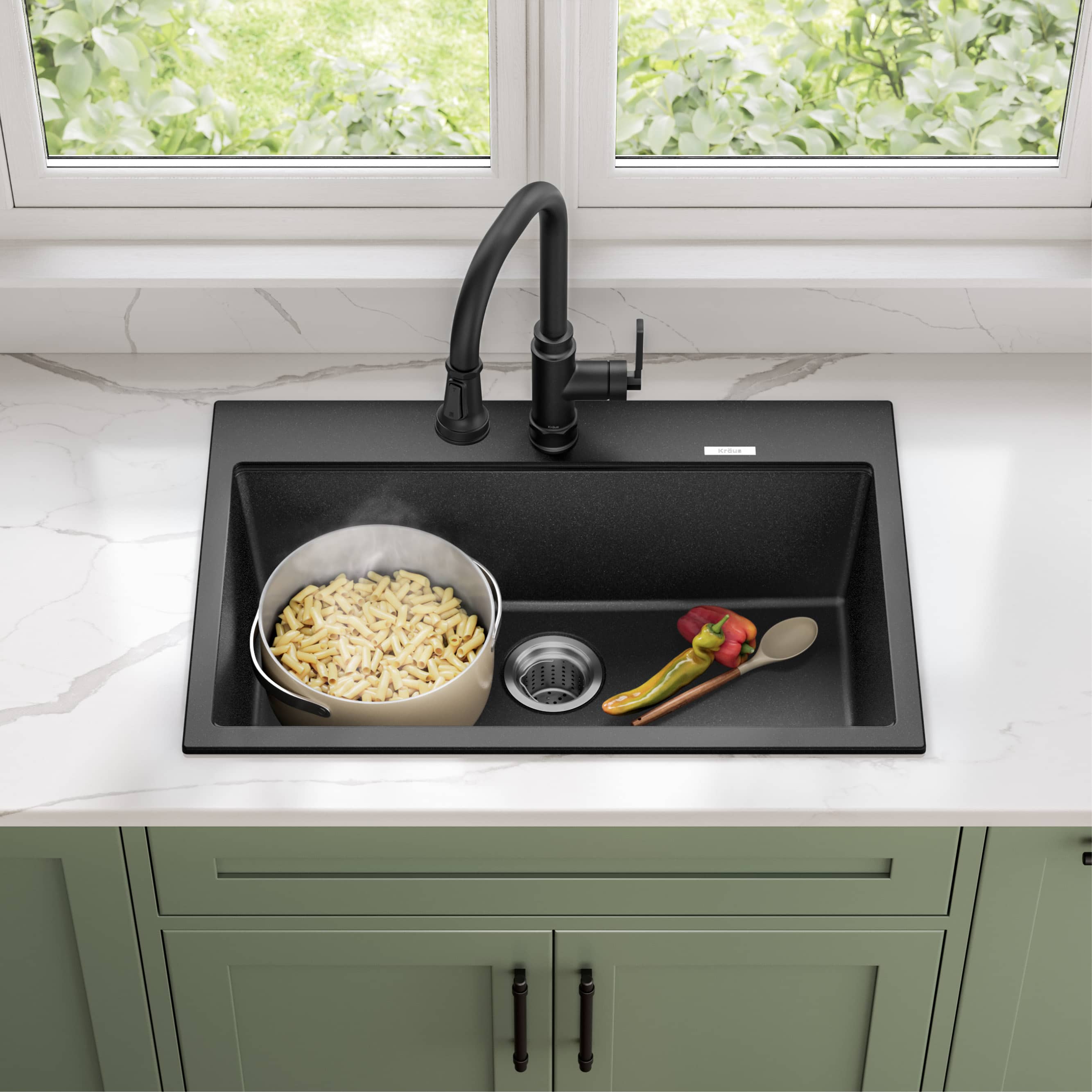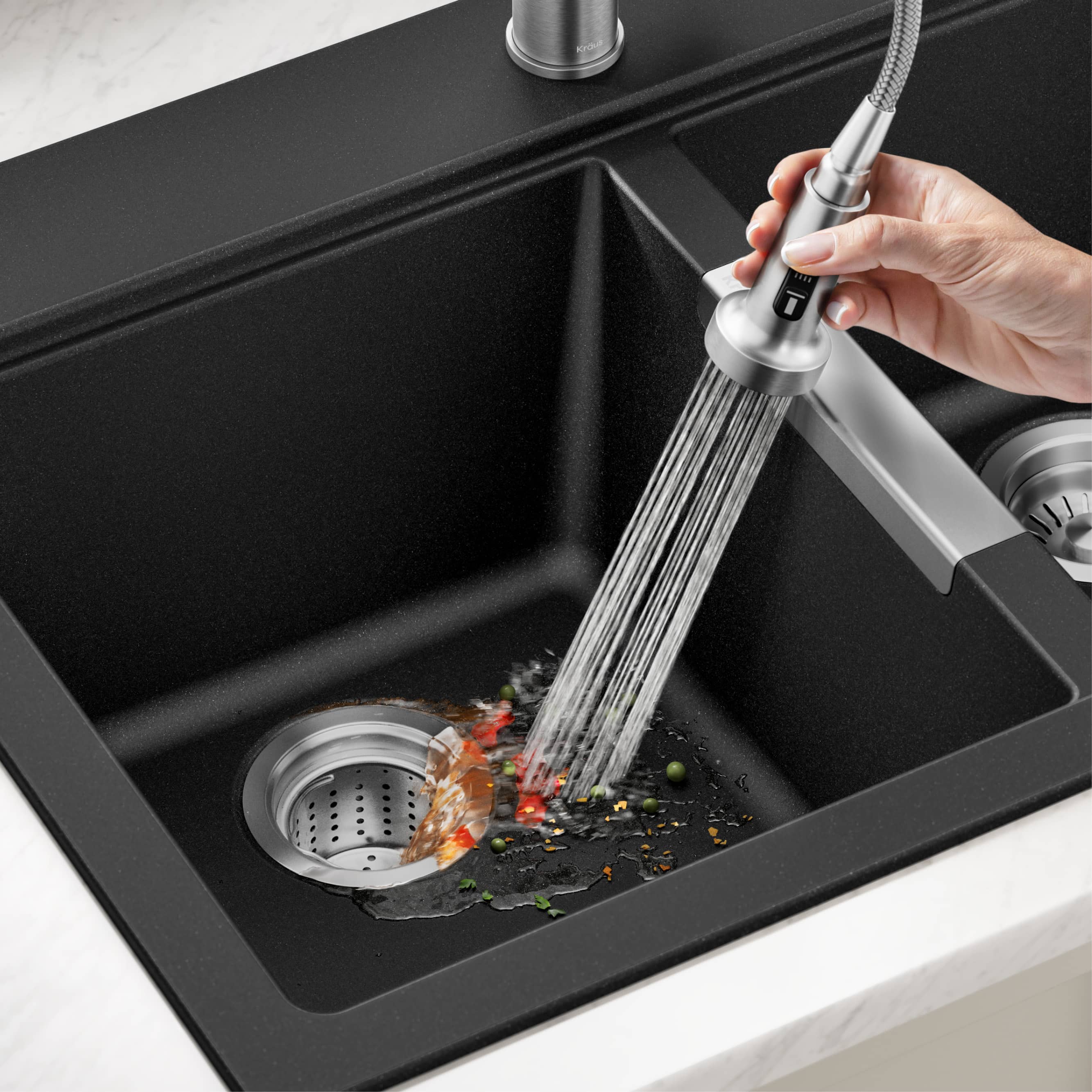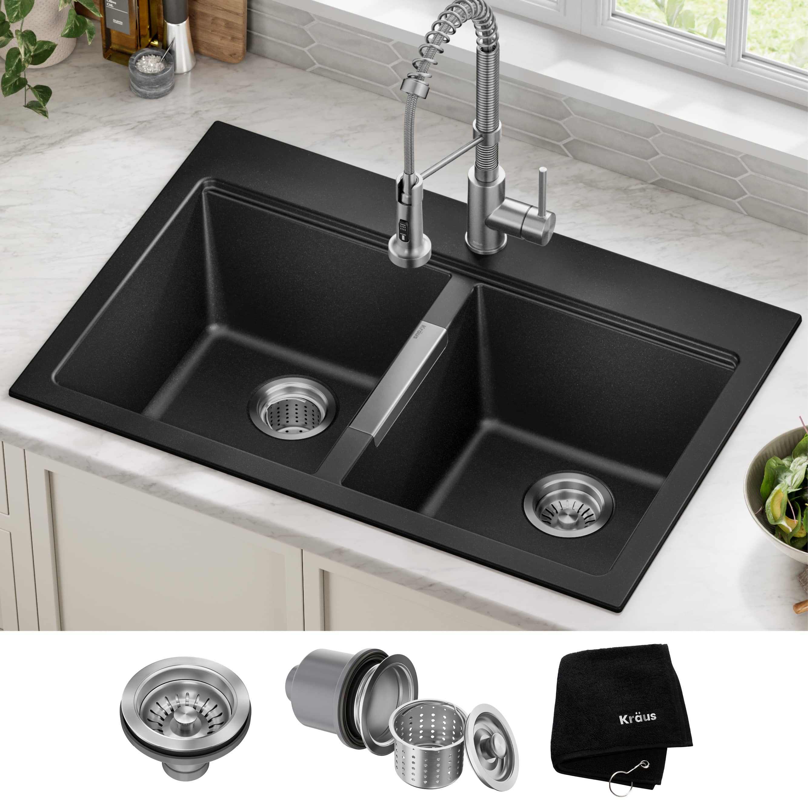 Kraus dual mount granite sinks create an instant style upgrade for the kitchen. Constructed from 80% natural granite, with the look and feel of real stone, these modern kitchen sinks look striking in a variety of settings. Clean lines and thoughtful design details highlight the organic elegance of granite, for an eye-catching look with contemporary appeal. The extra-deep basins accommodate large dishes with ease, while the gently rounded corners make sink maintenance simple. Each non-porous, naturally hygienic sink is protected with a thermal finishing process, creating a surface that is highly resistant to heat, chemicals, scratching, chipping, and discoloration. This double bowl sink provides a lifetime of functionality with versatile style. The 50/50 split basin adds flexibility for a variety of kitchen tasks. The basin is self rimming, creating a finished look for your kitchen. Choose from easy topmount installation, or install the sink as an undermount for a seamless look. For added convenience, a basket strainer drain assembly and complimentary towel are included free with purchase. Constructed from premium stainless steel, the top-quality basket strainer assembly creates a tight seal to prevent food and debris from clogging the drainpipe. For easy installation, all mounting hardware is provided. Experience Kraus Quality and bring your best kitchen ideas to life.Benefits & Features Constructed from 80% Natural Granite Looks and Feels Like Real Stone Naturally Sound-Absorbing Non-Porous Surface is Hygienic & Heat-Resistant Protected by Thermal Finishing Process Highly Resistant to Heat, Chipping, and Discoloration Extra-Deep Double.