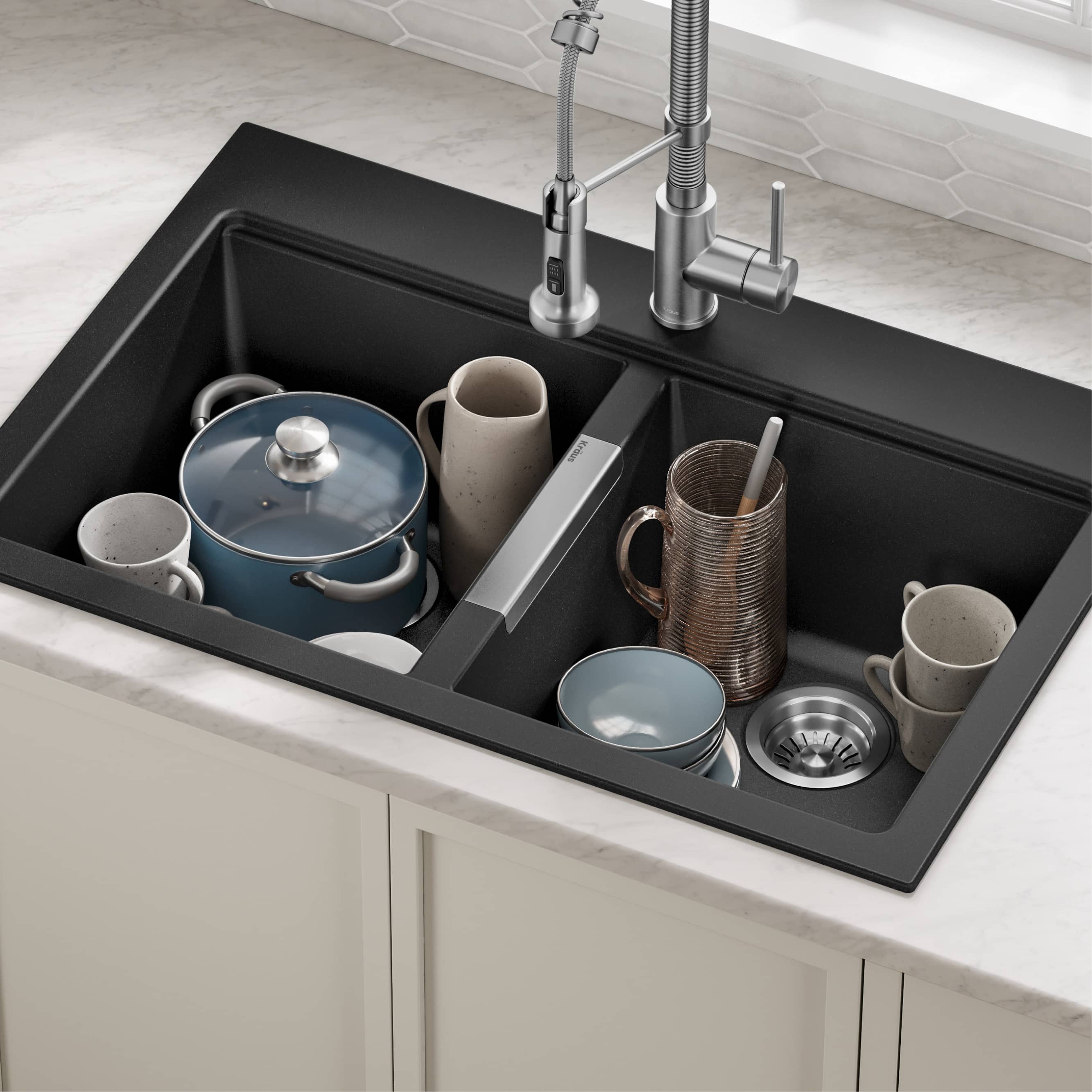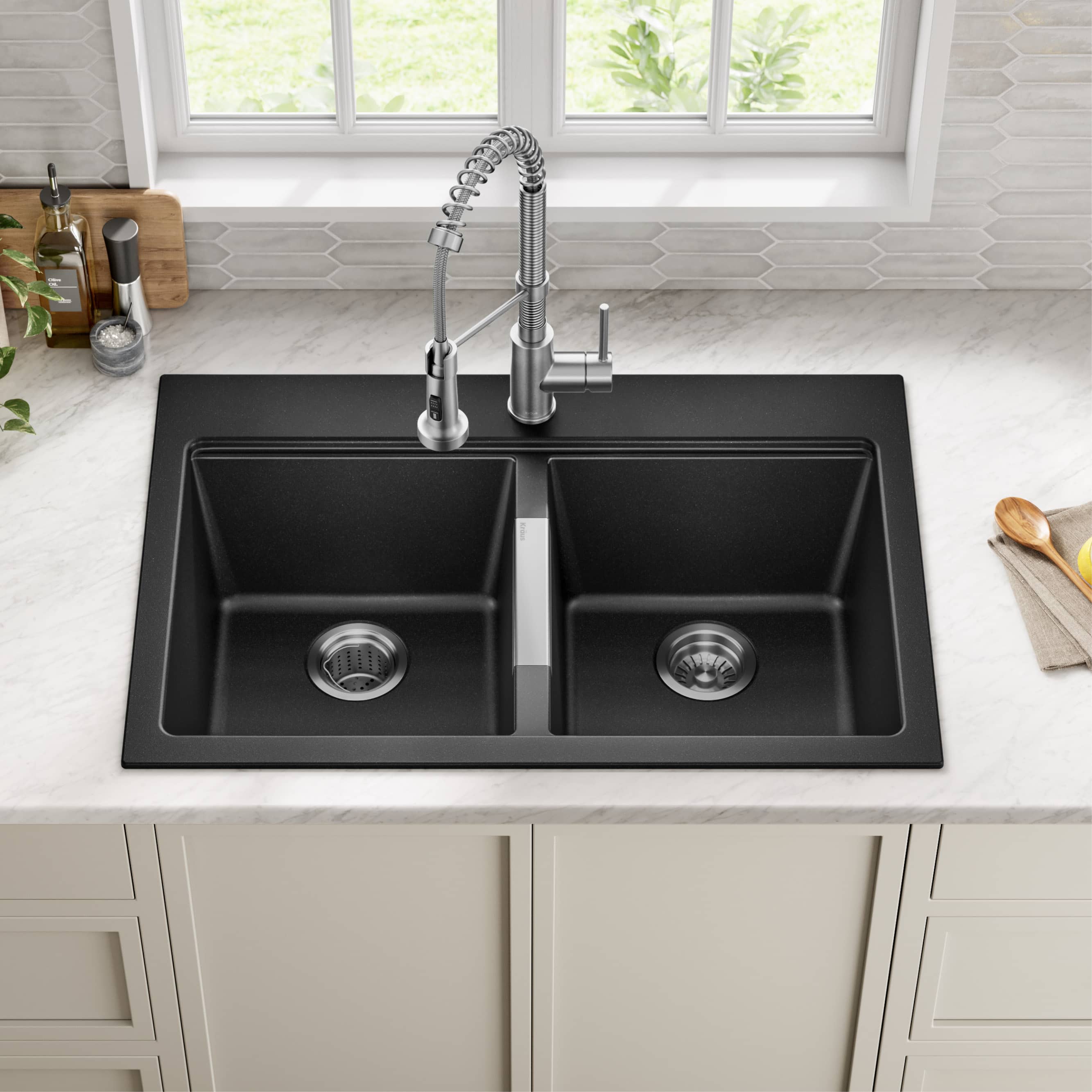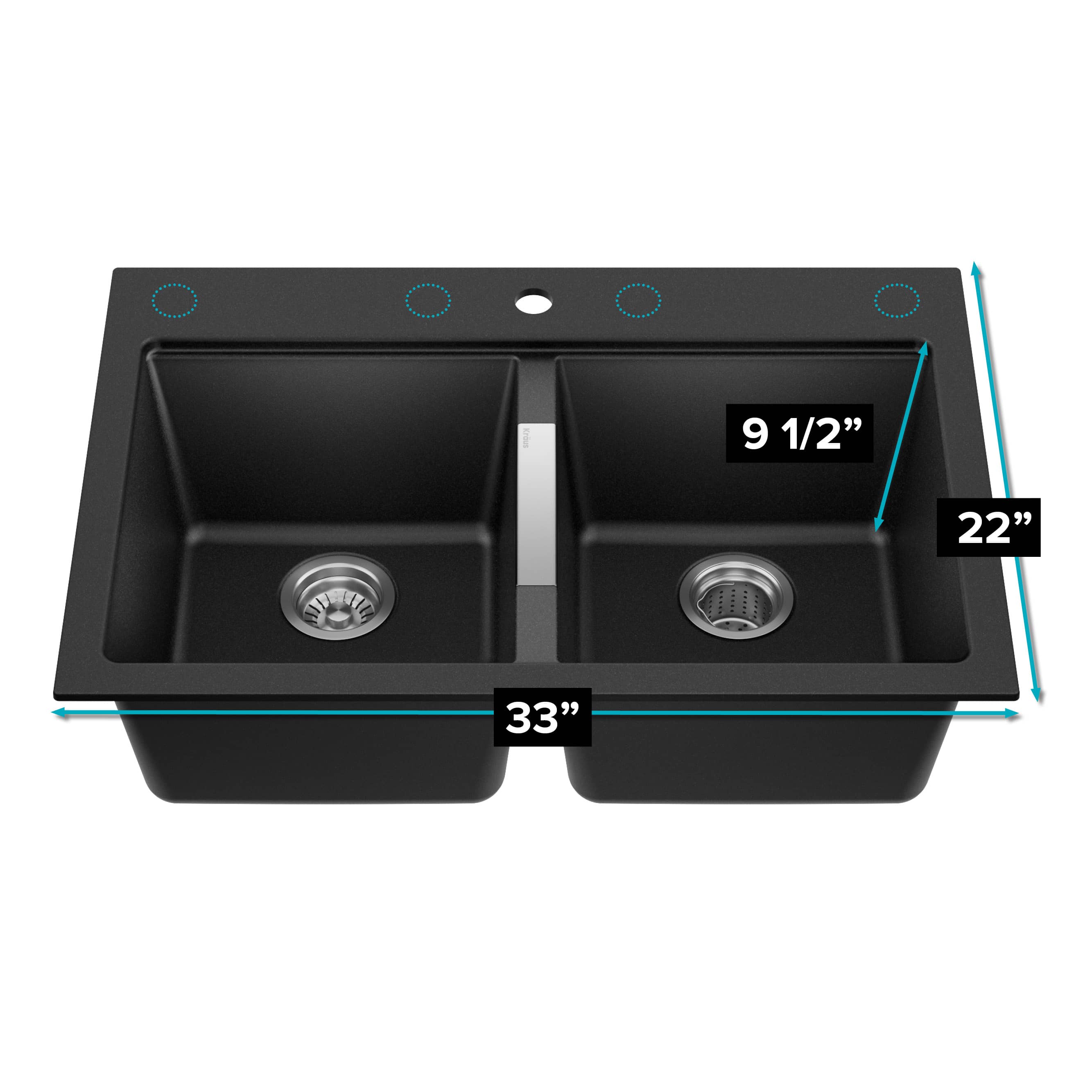 - KRAUS 33 Inch Dual Mount 50/50 Double Bowl Granite Kitchen Sink w/ Topmount and Undermount Installation in Black Onyx