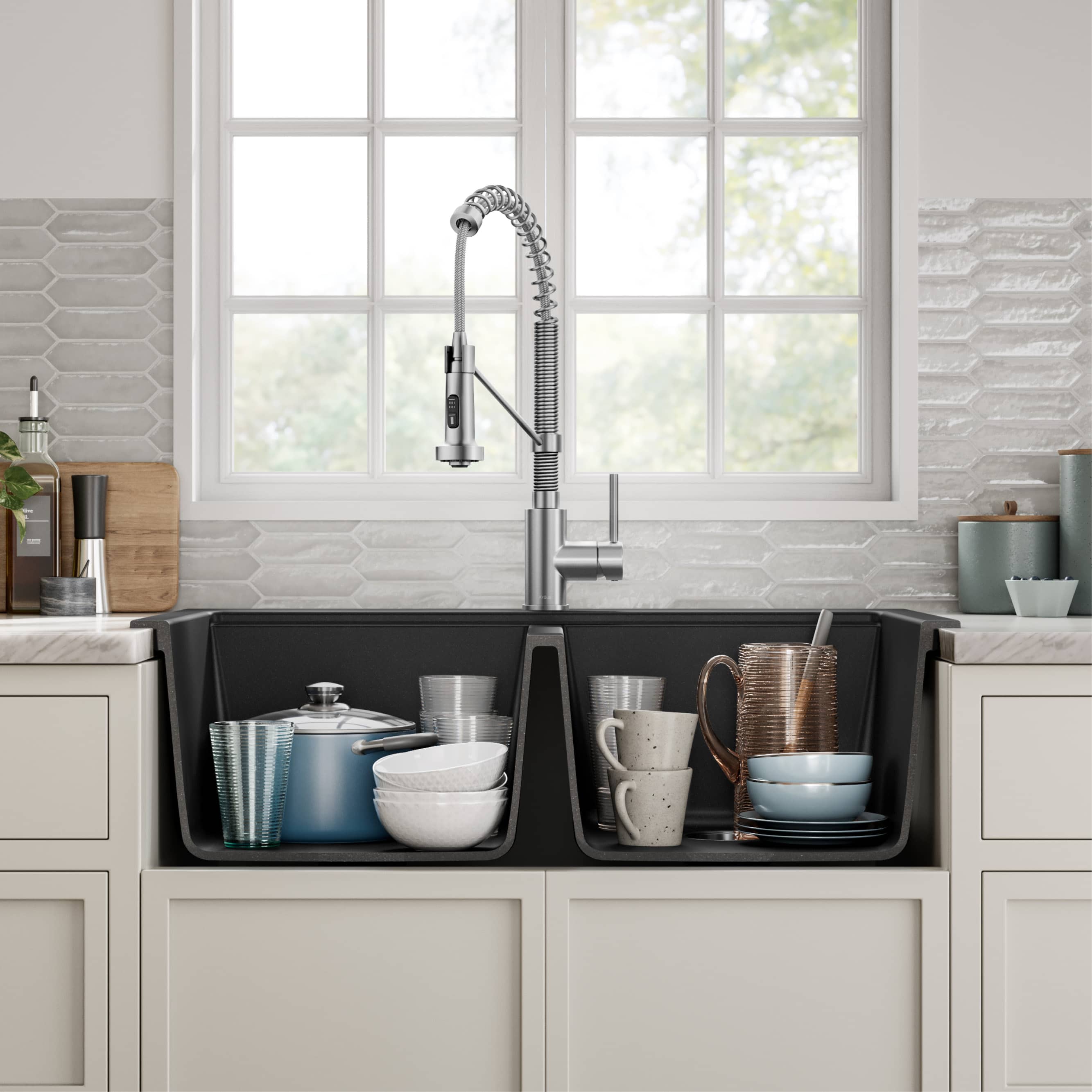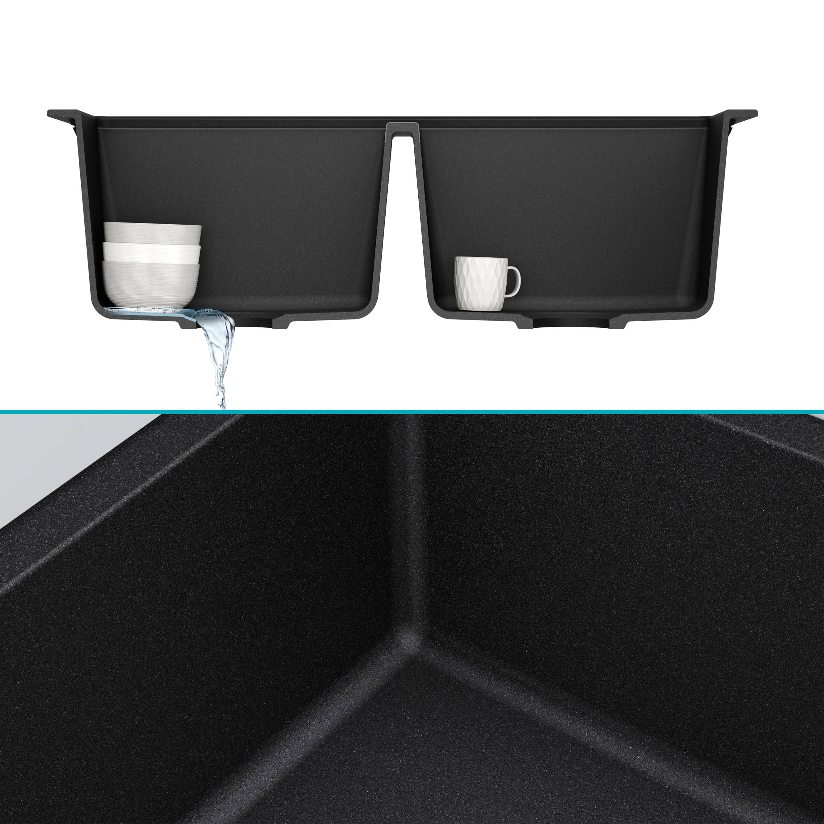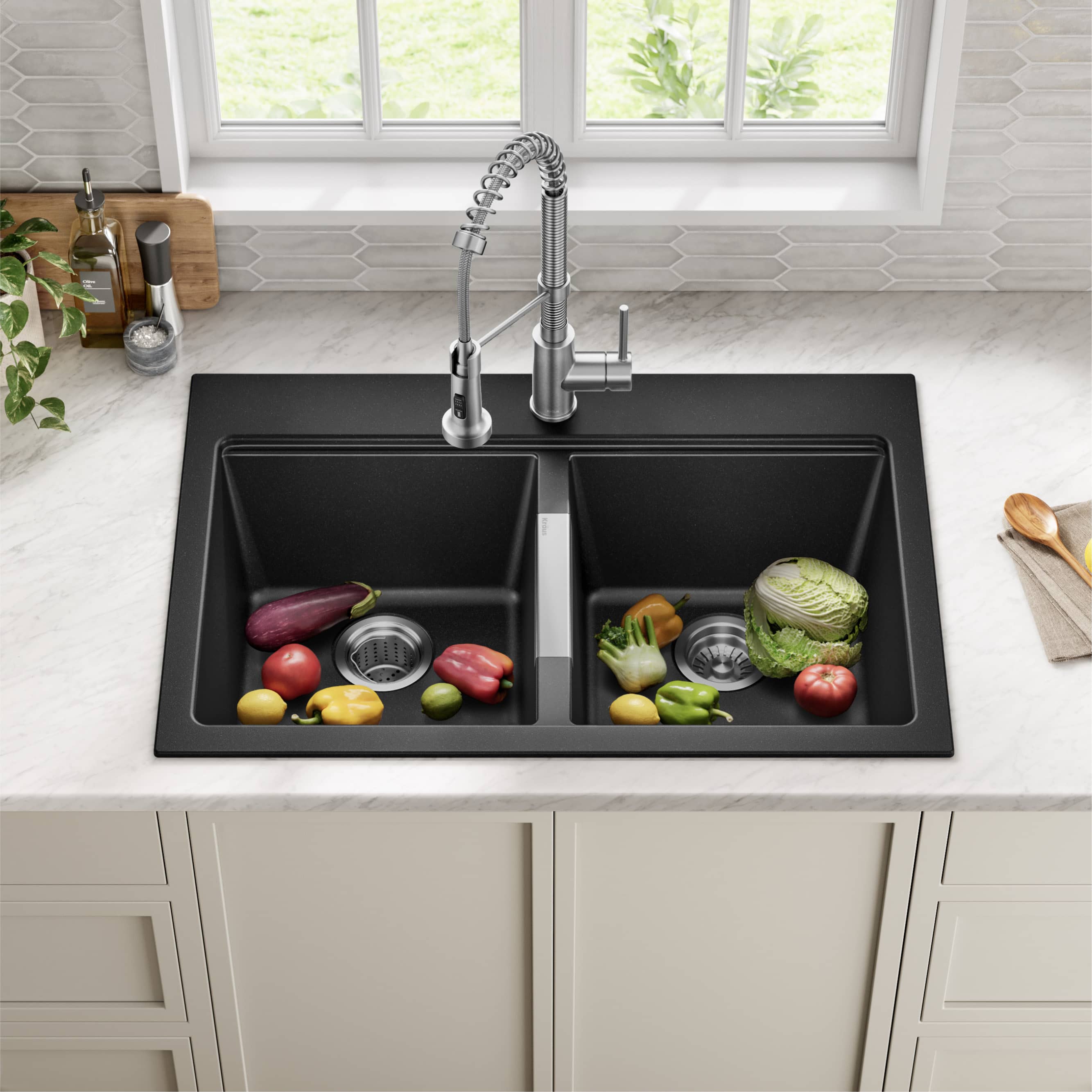 - KRAUS 33 Inch Dual Mount 50/50 Double Bowl Granite Kitchen Sink w/ Topmount and Undermount Installation in Black Onyx