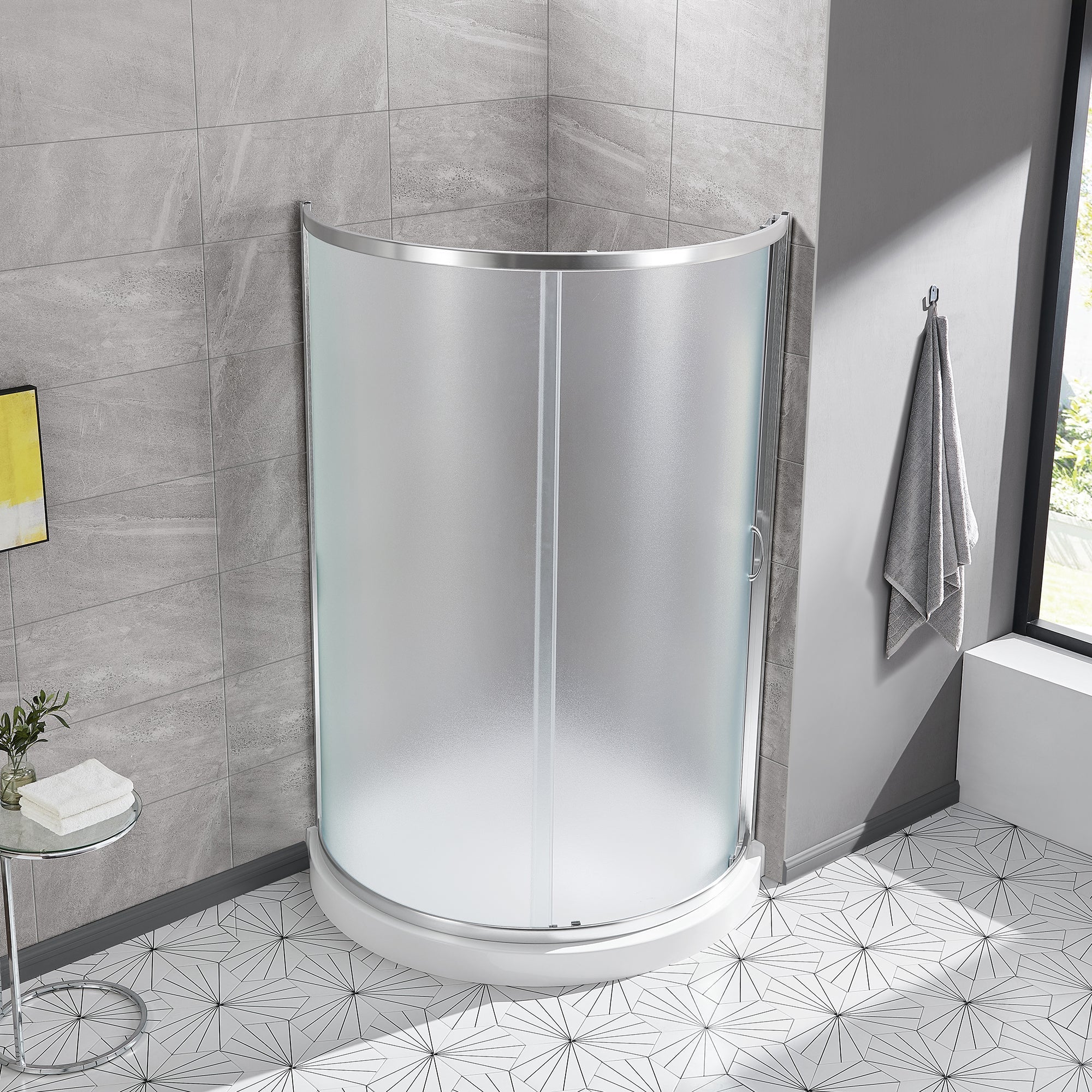 - Frosted 1/4-in (6 mm) thick privacy tempered glass panels with watertight seals
