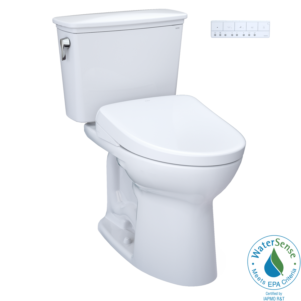 The TOTO Drake Transitional WASHLET + Two-Piece Elongated 1.28 GPF Universal Height TORNADO FLUSH Toilet with S7 Bidet Seat is designed to conceal the WASHLET power cord and water supply hose for a seamless installation. The WASHLET S7 features TOTO's technologically advanced EWATER+ system that mists the wand and toilet bowl, reducing the need for harsh cleaning chemicals. PREMIST wets the surface of the toilet bowl, aiding in the removal of waste and resulting in a better clean. The TOTO WASHLET S7 is fully automated, including an illuminated remote control with 5 spray settings, heated seat, and instantaneous water heating. The Drake features TOTOs TORNADO FLUSH, a rimless, hole-free design with dual-nozzles that creates a centrifugal washing action that assists in rinsing the bowl more efficiently. This version of the TOTO Drake includes CEFIONTECT, a layer of exceptionally smooth glaze that minimizes waste from sticking to the ceramic. CEFIONTECT, coupled with PREMIST and TORNADO FLUSH, assists to reduce the frequency of toilet cleanings, minimizing the usage of water, harsh chemicals, and time required for cleaning. This version of the TOTO Drake is designed in TOTOs Universal Height, which allows for a more comfortable seat position across a wide range of users. This WASHLET+ toilet includes WASHLET, Drake bowl and tank set with hardware, and toilet bolt caps. Compatible with T40 WASHLET+ toilet bowl components only. Additional items needed for installation must be purchased separately: wax ring, toilet mounting bolts, and toilet water supply lines.