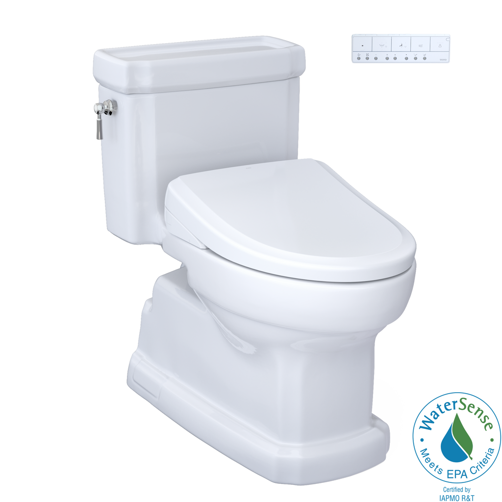 The TOTO WASHLET+ Eco Guinevere One-Piece Elongated 1.28 GPF Universal Height Skirted Toilet Classic WASHLET S7A Bidet Seat exemplifies TOTOs mark of excellence: "People Planet Water." Eco Guinevere features a sleek, one-piece design that will immediately beautify the appearance of your bathroom while proving easier to keep clean than a standard two-piece toilet. Eco Guinevere features TOTOs TORNADO FLUSH, a powerful hole-free rim design with dual-nozzles that create a centrifugal washing action to assist in rinsing the bowl more efficiently. TOTO's CEFIONTECT adds a layer of exceptionally smooth glaze to the bowl that minimizes waste from sticking to the ceramic. Includes the luxurious WASHLET S7A electric bidet toilet seat with 5 adjustable spray settings, heated seat, nightlight, 4 user memory settings, and endless warm water‘all at the touch of a button. Upgrade each bathroom visit to a transformational spa-like experience with the WASHLET as it helps to reduce the need for toilet paper, saving trees and water used to manufacture each roll. Eco Guinevere is ADA compliant and meets the standards for EPA WaterSense, and Californias CEC and CALGreen requirements. WASHLET+ Eco Guinevere has a left-hand chrome trip lever and includes mounting and installation hardware.